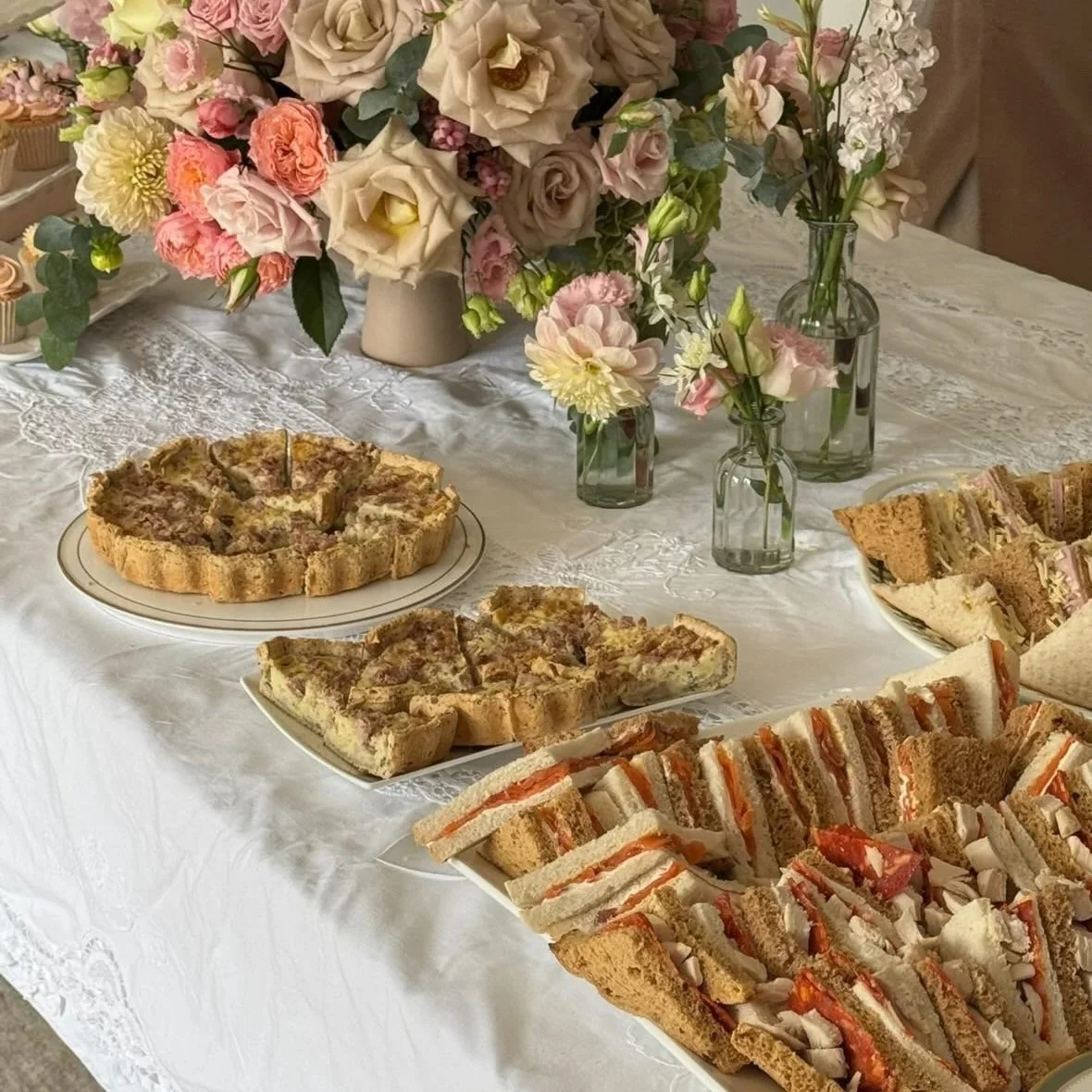Selection of sandwiches, homemade cakes, mini sausage rolls, mini cheese twists & mini quiche